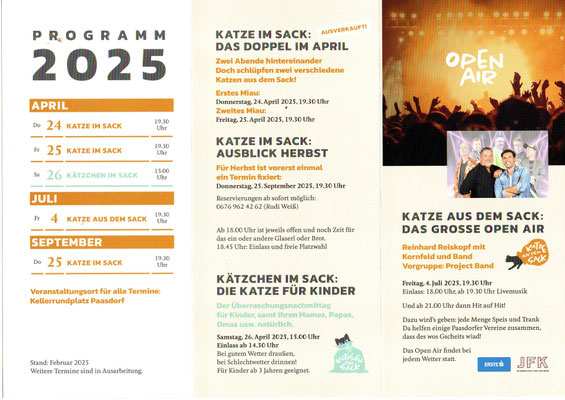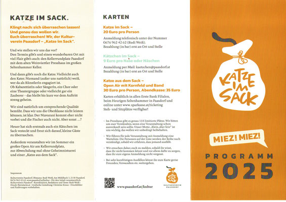 Wir beabsichtigen, pro Jahr 2 bis 4 kulturelle Veranstaltungen am Kellerrundplatz open air oder im Presshaus Seltenhammer durchzuführen. Der Clou dabei, wie unser Name „Katze im Sack“ schon andeutet: Niemand (außer uns natürlich) weiß, wer da als KünstlerIn engagiert ist. Es kann ein Kabarettist sein, eine Sängerin, eine Band, ein Chor oder vielleicht gar ein Zauberer …
